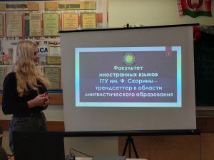 Профориентационная работа занимает важное место в деятельности высших учебных заведений, так как она является связующим звеном в системе «университет-школа». Профессиональное просвещение учащихся ориентировано на потребности и социальный заказ современного общества. Преподаватели и студенты факультета иностранных языков не остаются в стороне от решения данной проблемы и напрямую сотрудничают со средними учебными заведениями в ходе проведения учебных, производственных и преддипломных практик и во время проведения профориентационных мероприятий… Учебный год 2023-2024 не является исключением для факультета иностранных языков и, как прежде, профориентационная работа играет важную роль в деятельности факультета. В период педагогической практики (ноябрь-декабрь) студенты 4 курса специальностей «Иностранные языки (английский, немецкий), (английский, французский), «Иностранные языки (немецкий, английский) организовали ряд замечательных профориентационных мероприятий по ознакомлению выпускников средних школ с самым успешным и престижным региональным университетом и возможностями, которые открываются перед абитуриентами при поступлении в УО «ГГУ имени Ф. Скорины» и, в частности, на факультет иностранных языков.